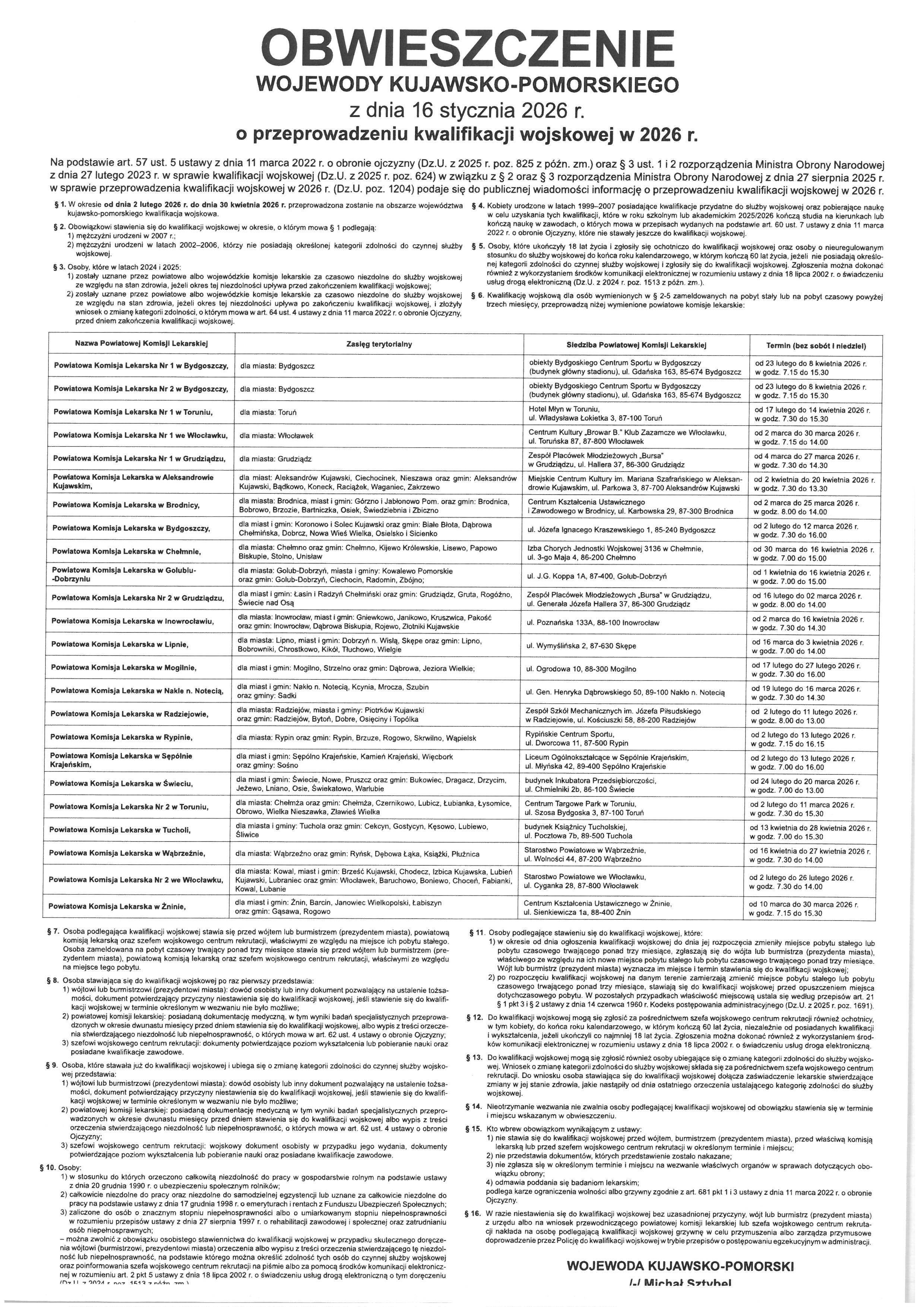 Obwieszczenie Wojewody Kuj.-Pom. o przeprowadzeniu Kwalifikacji Wojskowej w 2026 roku